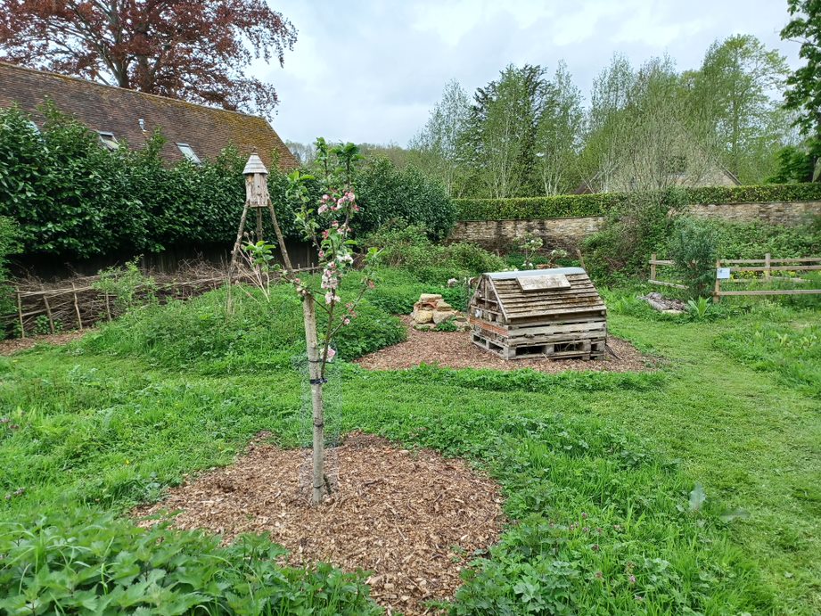 The area includes a range of features designed for insects, reptiles and small mammals. These have been created from recycled materials wherever possible. Amongst the features are two ponds, a bog garden, a bug hotel, two hibernacula (safe sites in which animals can shelter and hibernate) and a rocket beehive! Wildflowers, Sussex heritage fruit trees and pollinator-friendly plants have been included too. A sign by the entrance describes the features you can find.